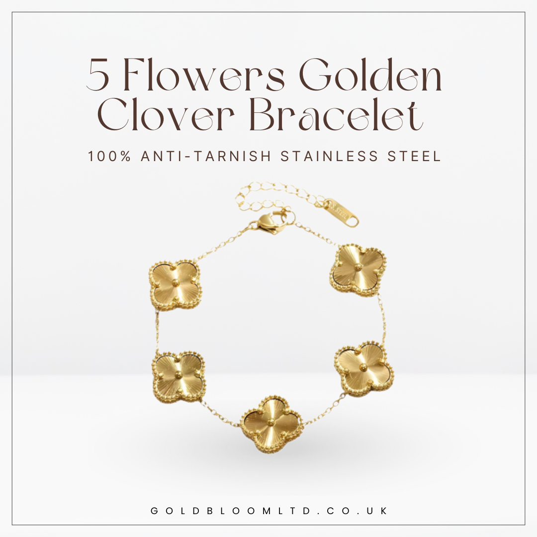 Elevate your style with this 5-Flower Clover Jewelry Set, crafted from premium stainless steel and finished with a luxurious 18K gold plating. Each piece features delicate clover blossoms symbolizing luck, love, and elegance. Designed to be waterproof, hypoallergenic, and non-tarnish, this set is perfect for everyday wear or special occasions.