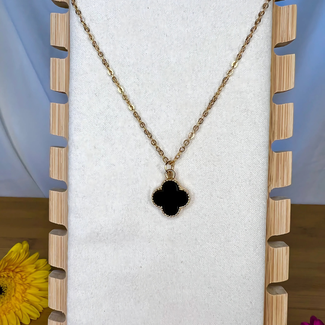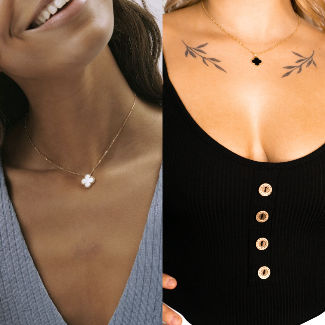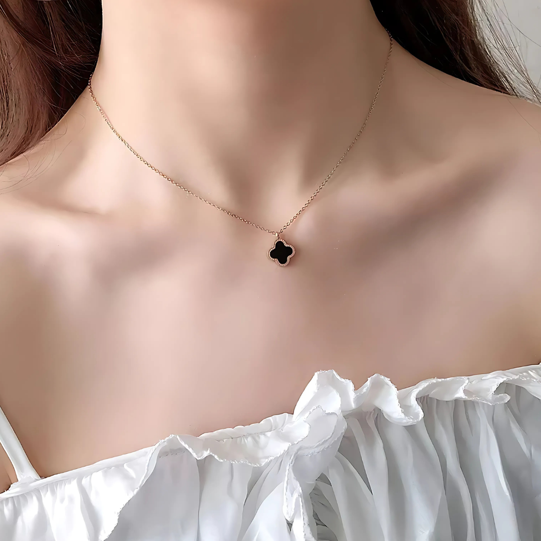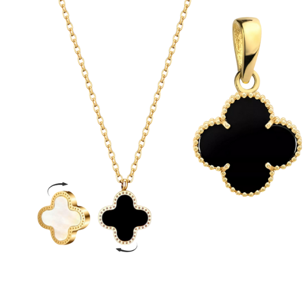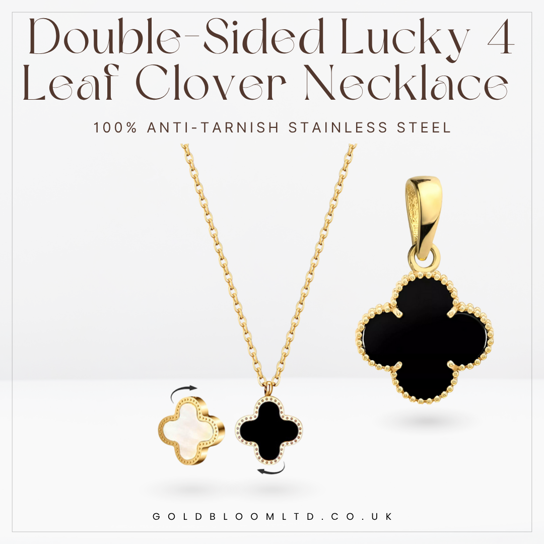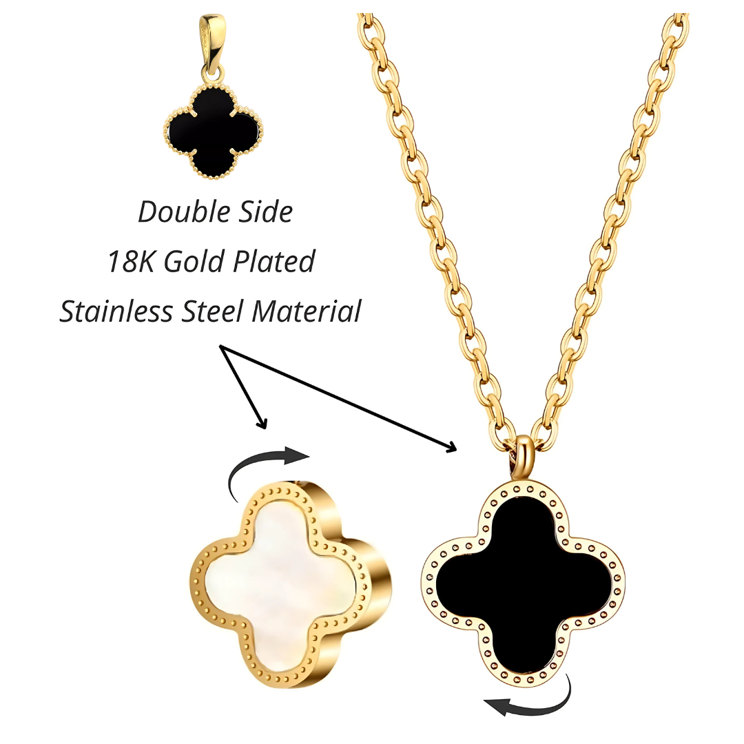 Elevate your everyday style with this Double Sided Lucky Necklace, crafted from high-quality stainless steel and plated in an elegant gold and black finish. Featuring a reversible clover design, it allows for two different looks in one necklace. Its waterproof, anti-tarnish, and hypoallergenic properties make it ideal for daily wear, while the symbolic 4-leaf clover charm adds a touch of positivity and charm.