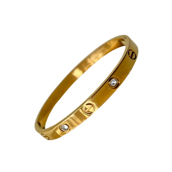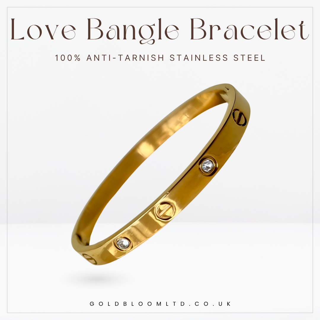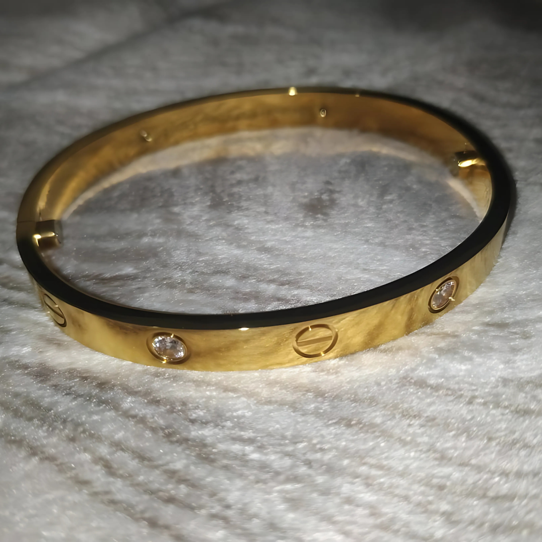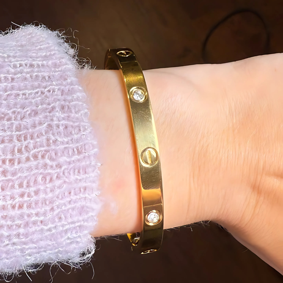 Turn everyday elegance into a signature statement with this Gold-Plated Cartier-Inspired Love Bangle. Crafted from premium stainless steel, this sleek bracelet features sparkling cubic zirconia accents and a timeless design that complements any outfit.
